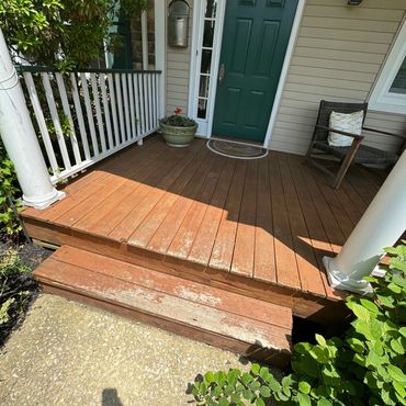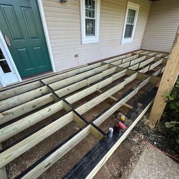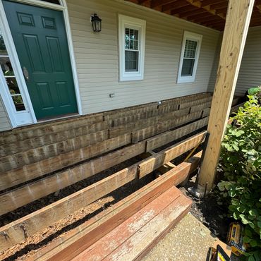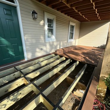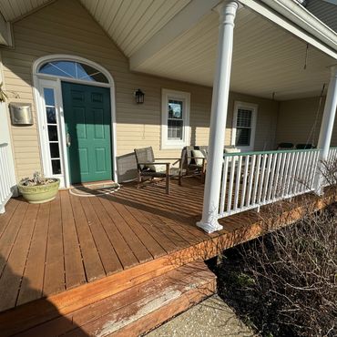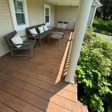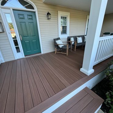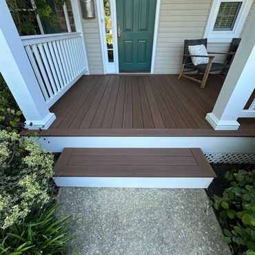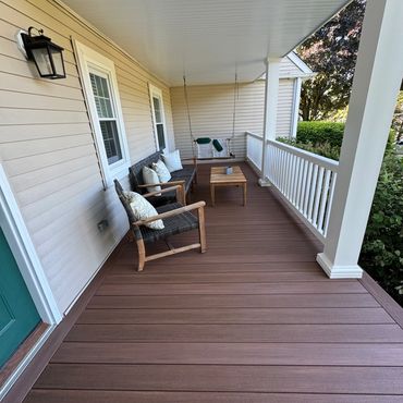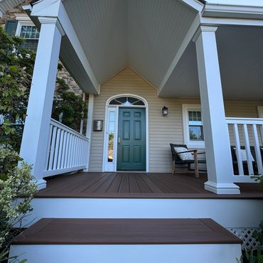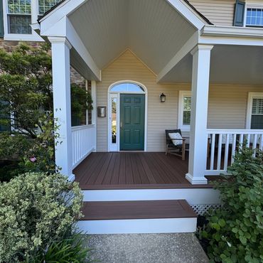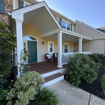 This worn-out enclosed porch / deck was in desperate need of an update. The customer wanted to keep the existing look but utilize all new materials. This deck was completely torn out, reframed utilizing butyl tape on joists, and high-end composite decking installed. Additionally, new steps were framed, Azek facia and lattice were utilized, new structural fiberglass columns installed, Azek beadboard ceiling planks replaced the old sagging vinyl ceiling, and new aluminum lined vinyl railings were installed. This may look similar at first glance, but the transformation is remarkable.